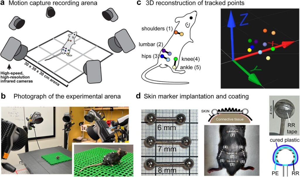 The system, developed by OIST’s Neuronal Rhythms in Movement Unit, uses reflective markers and a multi-camera setup to capture high-resolution, 3D movement data from freely moving mice. Think of it as a Pixar-grade rig, but for neuroscience. The researchers placed stainless steel, reflective-coated spheres at key points on the mice’s bodies—joints, limbs, tail base—to track full-body motion as the animals ran, climbed, and explored. The setup included three open arenas: a flat surface, a treadmill, and a climbing wheel, each surrounded by cameras that recorded the reflected light from the markers in real time.