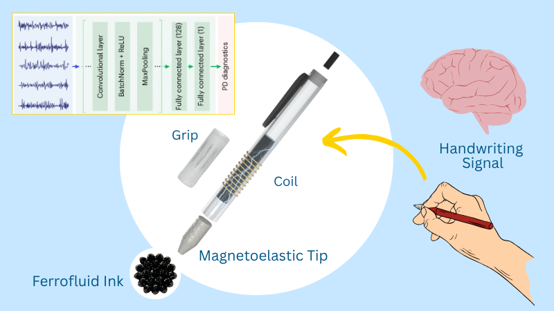 The science behind the pen is rooted in the magnetoelastic effect. As the pen’s tip deforms during writing, its magnetic properties shift. Simultaneously, the ferrofluid ink flows and reacts to these changes. Together, these movements induce a voltage in the pen’s internal coil, producing a stream of electrical signals that reflect the user’s motor control. It’s a clever fusion of materials science, bioengineering, and AI—wrapped in a device that looks deceptively simple.