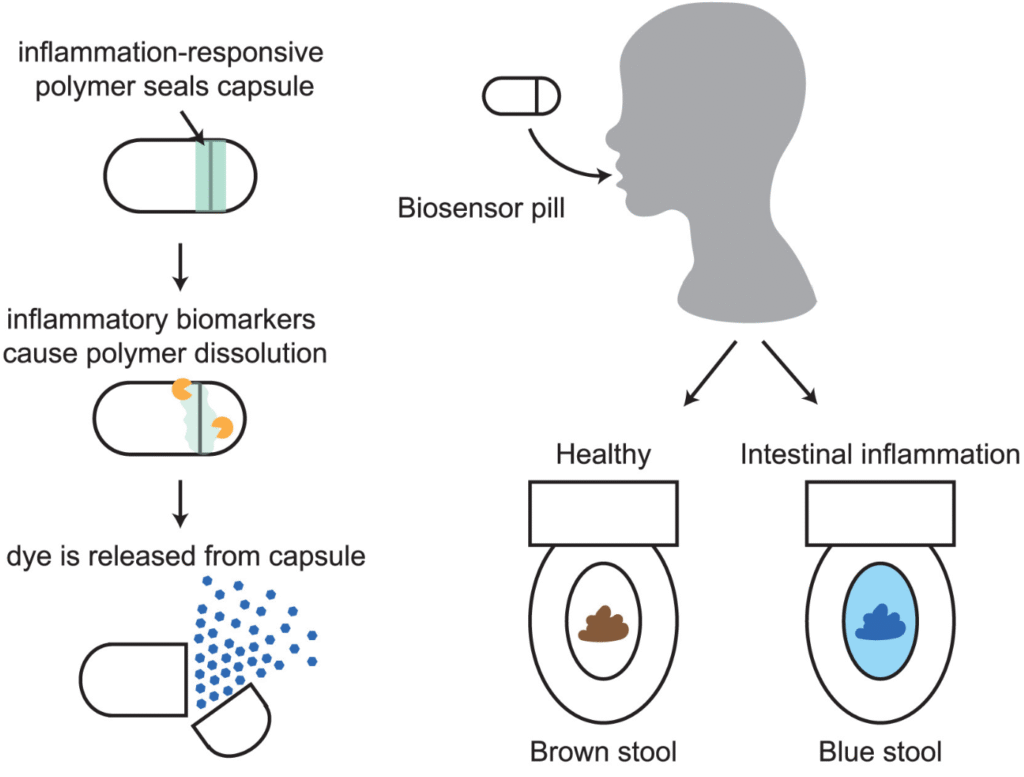 Researchers at Mass General Brigham and the University of Toronto have developed a swallowable biosensor pill called PRIM (Pill for ROS-responsive Inflammation Monitoring) that detects intestinal inflammation by releasing a visible blue dye in response to elevated levels of reactive oxygen species (ROS)—a chemical marker associated with inflammatory bowel diseases (IBD) like Crohn’s and ulcerative colitis.