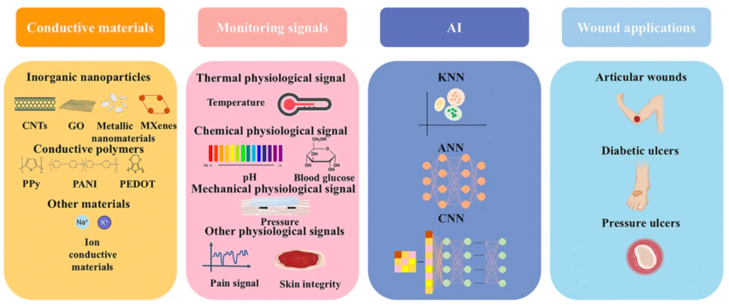 Beyond monitoring, the dressings also support healing through electroactive stimulation, antibacterial properties, and controlled drug release. The review details a range of conductive materials used to enhance these functions, including carbon nanotubes, graphene, MXenes, and conductive polymers. These materials improve biocompatibility, sensitivity, and long-term stability.