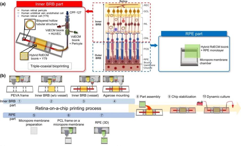 To address this, the research team created a 3D-bioprinted retina-on-a-chip using a hybrid bioink made from retinal decellularized extracellular matrix (RdECM). This bioink was used to fabricate layered structures that include both vascular and neural components. By inducing vascular occlusion within the chip, the model successfully reproduced key features of RVO, including inflammation, barrier dysfunction, and pathological angiogenesis. The system allowed researchers to observe how endothelial and retinal cells interact under disease conditions.