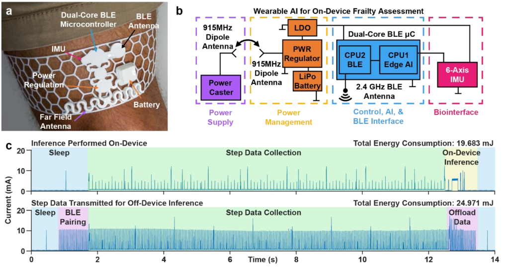The device takes the form of a soft mesh sleeve worn around the lower thigh. It continuously monitors gait patterns, which are strong indicators of frailty risk. Embedded AI models analyze movement data directly on the device, allowing it to detect subtle changes without relying on constant connectivity, cloud processing, or large data transfers. This design addresses a major limitation of many digital health tools, which often require frequent charging or continuous data streaming to external systems.