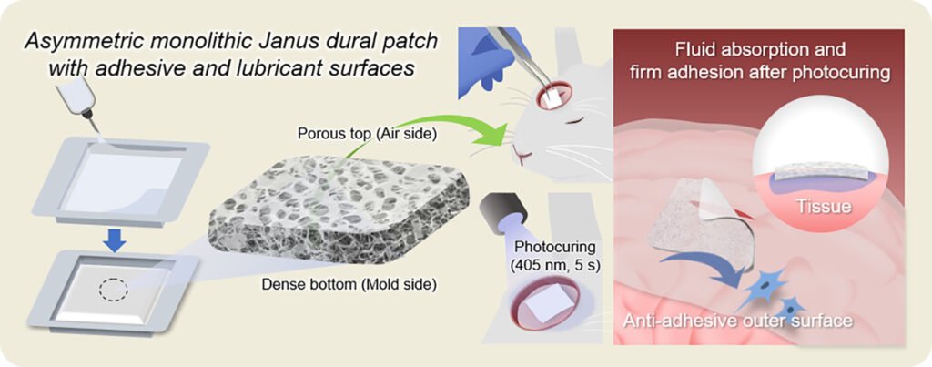 The team created a Janus patch with two distinct sides that work together to achieve effective sealing. One side is engineered for strong adhesion to the dura when activated by light, while the other side is optimized for high fluid absorption with minimal volume change. This design allows the patch to quickly stop cerebrospinal fluid leakage without exerting harmful pressure on surrounding tissue. When exposed to light of a specific wavelength, the adhesive components crosslink and bond firmly to the tissue surface, giving surgeons precise temporal control over when and where the patch adheres. Laboratory tests showed that the patch can achieve rapid, watertight sealing of dural defects and maintain integrity under physiologically relevant pressures.