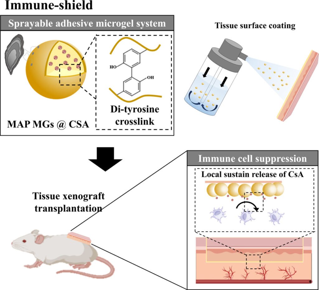 The technology, called “Immune‑Shield”, uses microgels made from mussel‑derived adhesive proteins that can stick firmly to wet biological surfaces. When sprayed onto an organ, the microgels form a thin, invisible coating that remains in place and slowly releases immunosuppressive drugs directly where they are needed. This approach ensures that the medication acts at the transplant site rather than dispersing through the bloodstream. The team demonstrated that the coating adheres reliably even on complex organ geometries, a key requirement for practical surgical use.