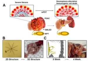 Researchers at the Korea Advanced Institute of Science and Technology (KAIST) have developed an implantable, shape‑morphing 3D micro‑LED device designed to overcome barriers in pancreatic cancer treatment. Conventional therapies are limited by the dense tumor microenvironment, which blocks drugs and immune cells, while external lasers used in photodynamic therapy cannot penetrate deep tissue and risk damaging healthy organs. The new device uses a flexible, octopus‑like architecture that wraps around the tumor, maintaining uniform light delivery even as the tissue expands or contracts. This enables continuous, low‑intensity photostimulation that targets cancer cells while preserving normal tissue. In in vivo mouse experiments, the technology…