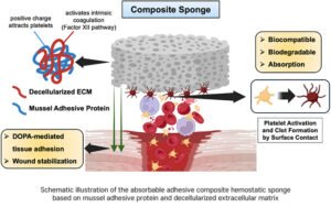 Researchers at Pohang University of Science and Technology (POSTECH) in Korea have created a bioadhesive sponge that can rapidly stop internal bleeding, especially in high-risk surgeries involving organs like the liver or spleen. The sponge combines mussel adhesive protein with decellularized extracellular matrix (dECM) to provide strong tissue adhesion and support wound healing. Traditional hemostatic agents often fail to stick to wet tissue or degrade properly, leading to complications. The POSTECH sponge addresses these issues by adhering firmly to bleeding sites and activating the body’s natural clotting mechanisms. Once bleeding is controlled, the sponge biodegrades safely, while the dECM promotes…